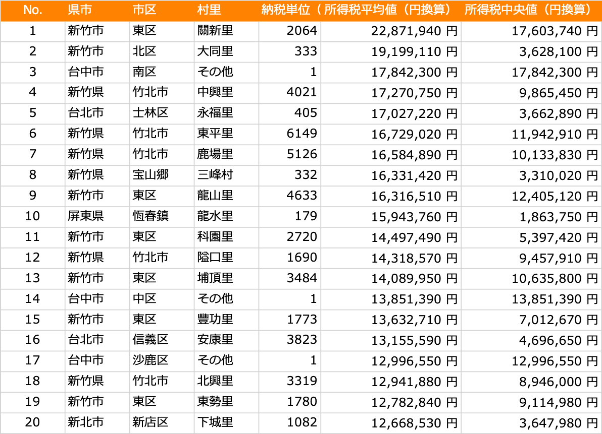 台湾政府の最新統計によると、新竹市エリアが平均所得ランキングの上位を独占しています。