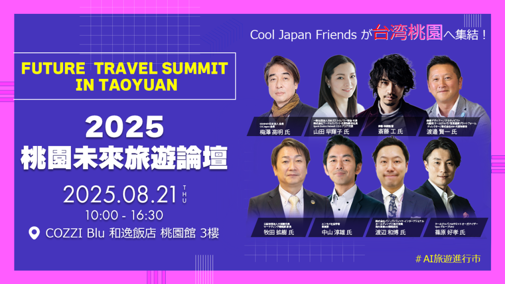 日本の観光業界を牽引する専門家、最先端テクノロジーのリーダー、そして世界を代表するブランドのキーパーソンが一堂に会し、グローバルな観光市場における最新トレンドを分析します。桃園市がAIを活用したスマートアプリケーションにより、観光の魅力をいかに高め、国際観光客を誘致し、台湾観光産業の変革と持続的発展をどのように推進できるかについて、議論が交わされます。