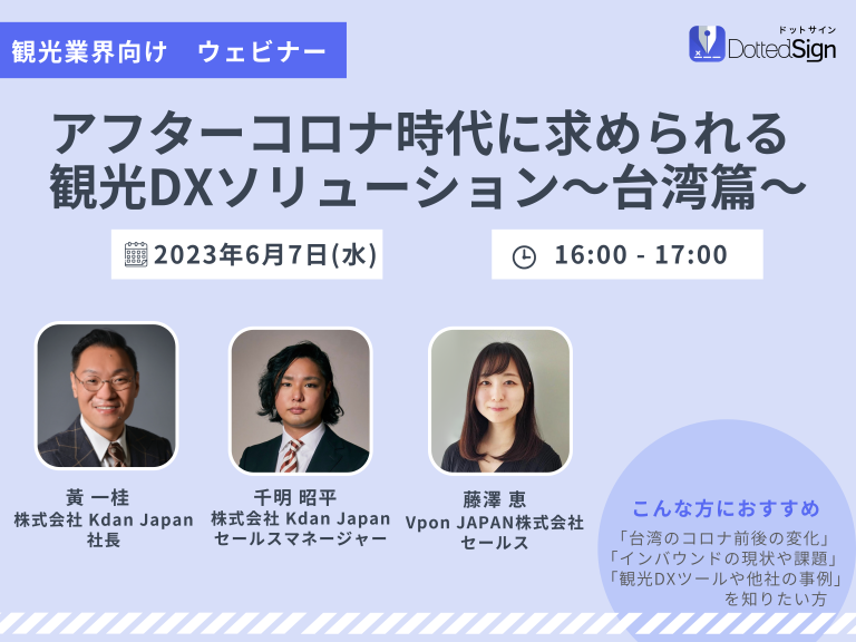 コロナ禍を契機に、観光業界でもDXの重要性が一層高まっています。本ウェビナーでは、電子契約サービス「DottedSign(ドットサイン)」を提供する Kdan Japan と共催し、台湾の最新状況日本の観光業界が抱えている課題、それらを解決するためのDXツール活用方法をご紹介します。本ウェビナーを通して、皆様が訪日インバウンドにおける集客のヒントや新たな気づきを得ると同時に、DXによって生まれるビジネスチャンスを掴むきっかけになれば幸いです。