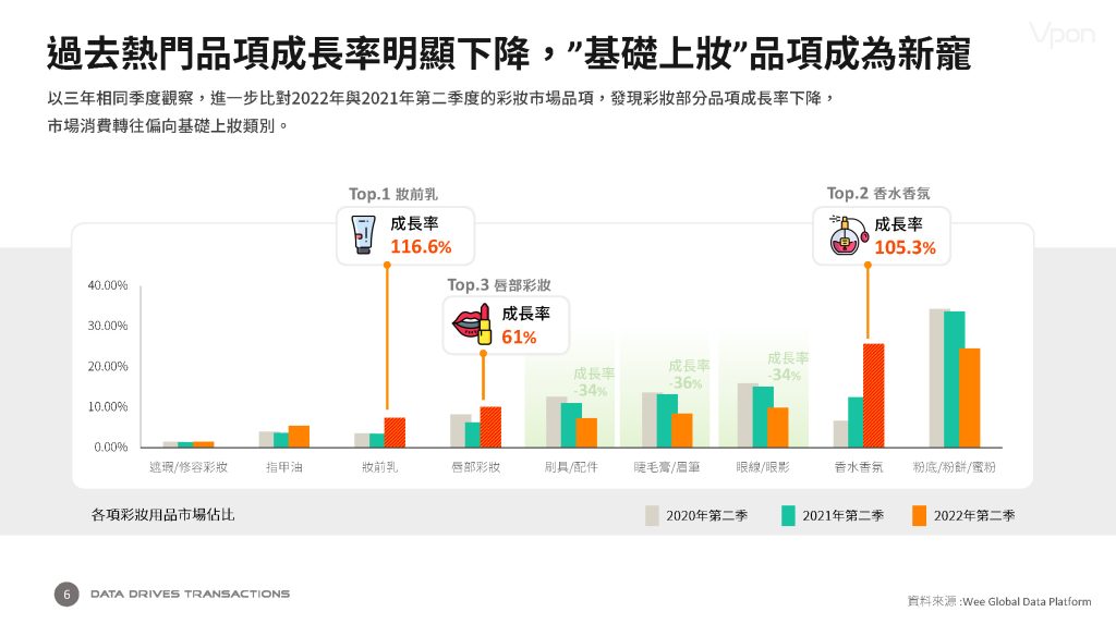 疫情期間戴口罩,不少消費者對彩妝品需求下降,連帶影響了美妝市場的消費習慣。根據Vpon威朋大數據集團利用獨家數據庫Vpon DMP分析發布的「大數據掌握發展先機-2023年美妝產業趨勢洞察報告」分別針對彩妝品及保養品的購買趨勢、族群及通路數據進行分析,發現台灣疫情爆發時,妝前乳、香水香氛類及唇部彩妝等購買成長率為品項前三名,2022第二季較2021年第二季分別成長116.6%、105.3%及61%。