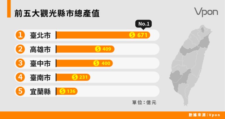 Vpon威朋的數據團隊比較2021年各縣市觀光總產值,六都中有四都為熱門的國旅目的地,臺北市高達671億元,位居全國第一,其次為高雄市409億元、臺中市400億元、臺南市231億元,宜蘭縣受惠於鄰近大台北地區的優勢,為非六都中最受歡迎的國旅目的地,觀光年產值136億元。